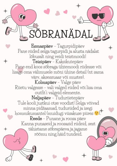 Asukoht Koigi Kool Huvitegevus Õppetöö Ava foto Koigi Koolis tähistatakse sõbranädalat stiilipäevadega. Vaata rohkem sündmusi Ava foto Avaldatud 05.02.2026. Viimati muudetud 05.02.2026.