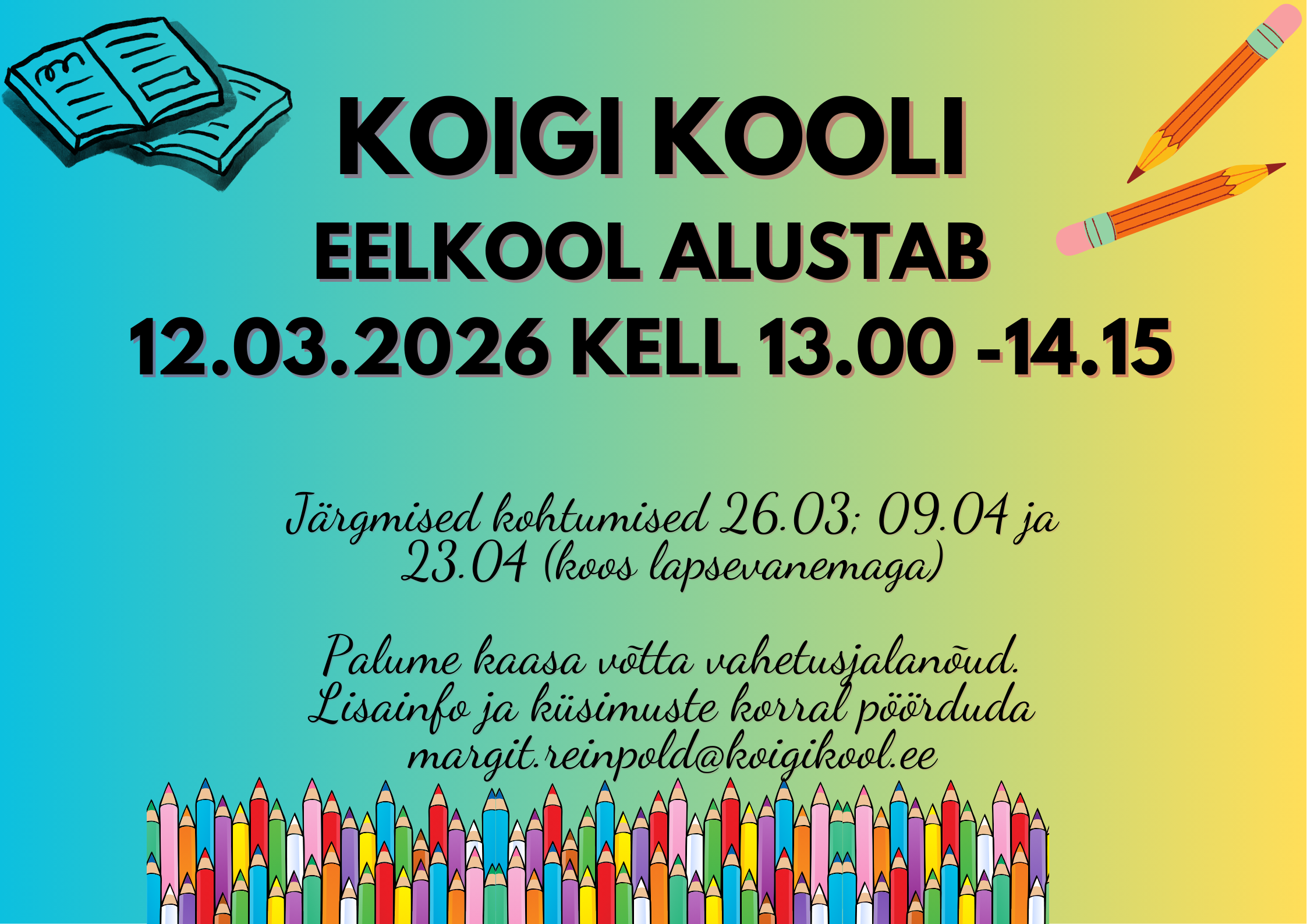 Koigi Kool ootab 1. klassi (2026/27 õa) tulijaid esimesele kohtumisele 12.03.2026.
